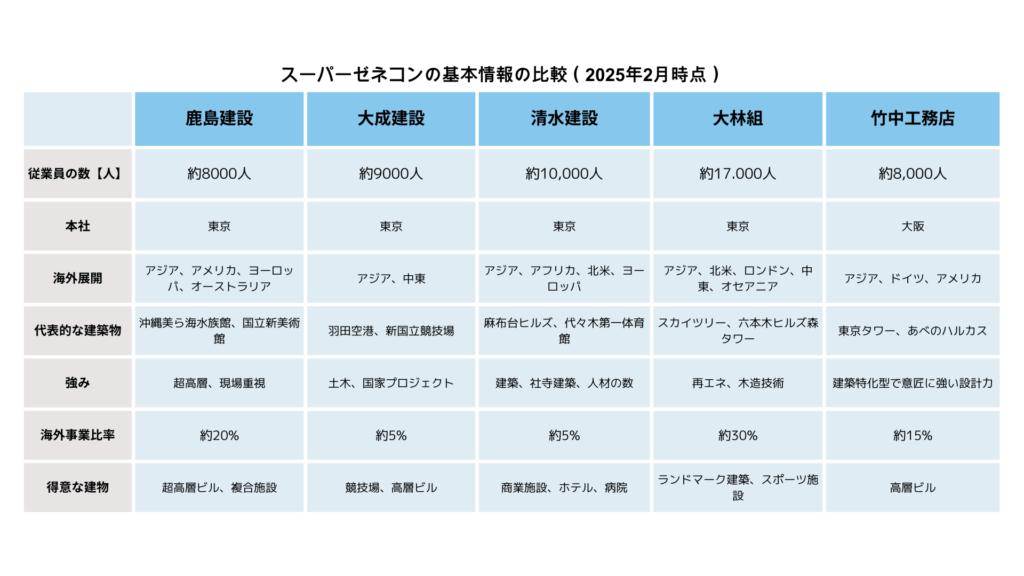 スーパーゼネコンの中でも、企業によって規模感や強みは異なります。